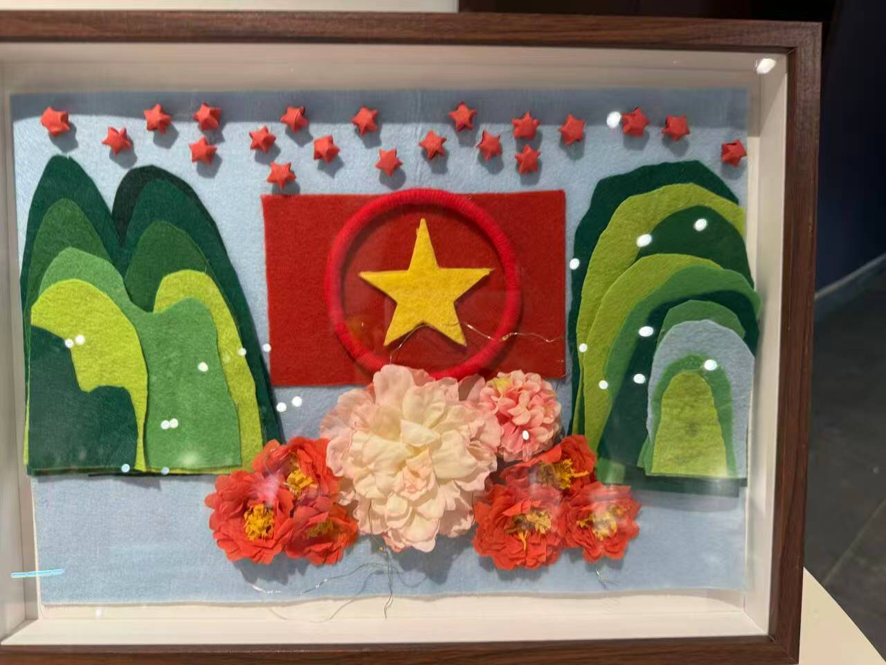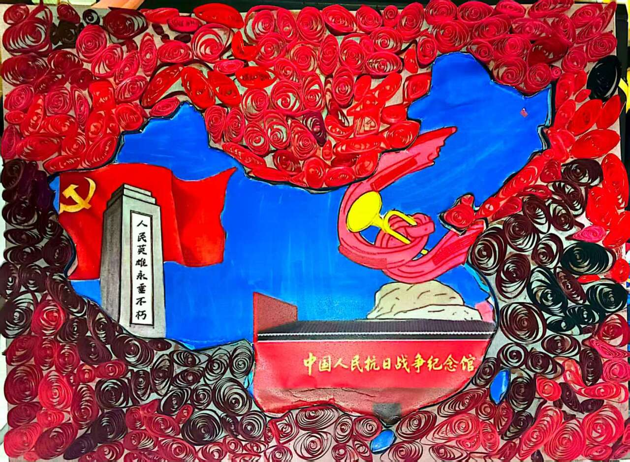这幅衍纸作品以中国地图为背景,融入人民英雄纪念碑、中国人民抗日战争纪念馆等元素,还有党旗、军号等符号,用衍纸工艺生动展现对英雄的缅怀与对历史的铭记,传递出深厚的爱国情怀与对革命历史的致敬。