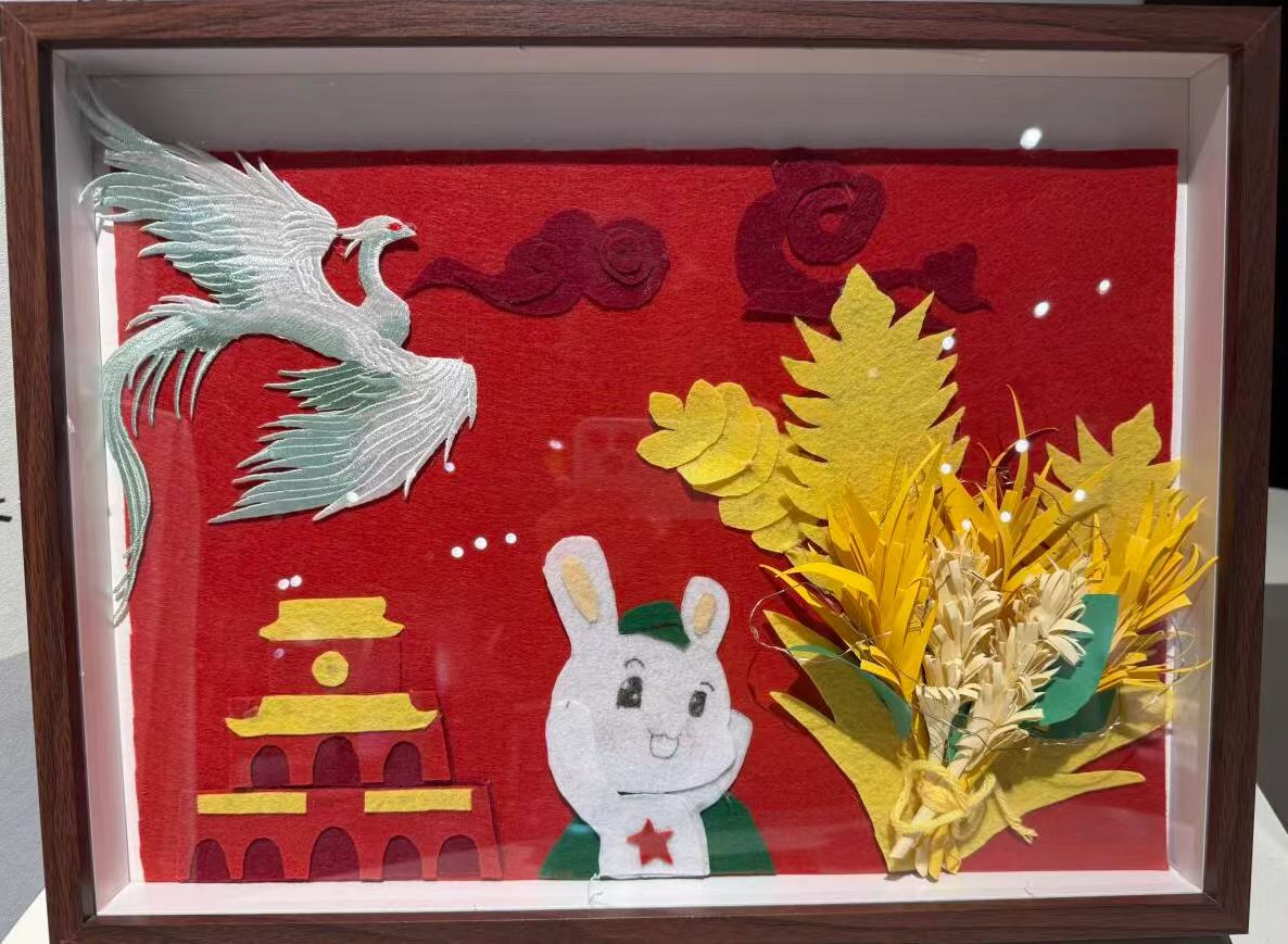 这幅衍纸作品以“抗战胜利80周年”为主题。画面有白鸽、号角等元素、日本向中国递交投降书的历史时刻和人物形象,传递了和平与胜利的喜悦,展现了先辈为抗日战争所做的努力,饱含了对历史的铭记与对和平的珍视。