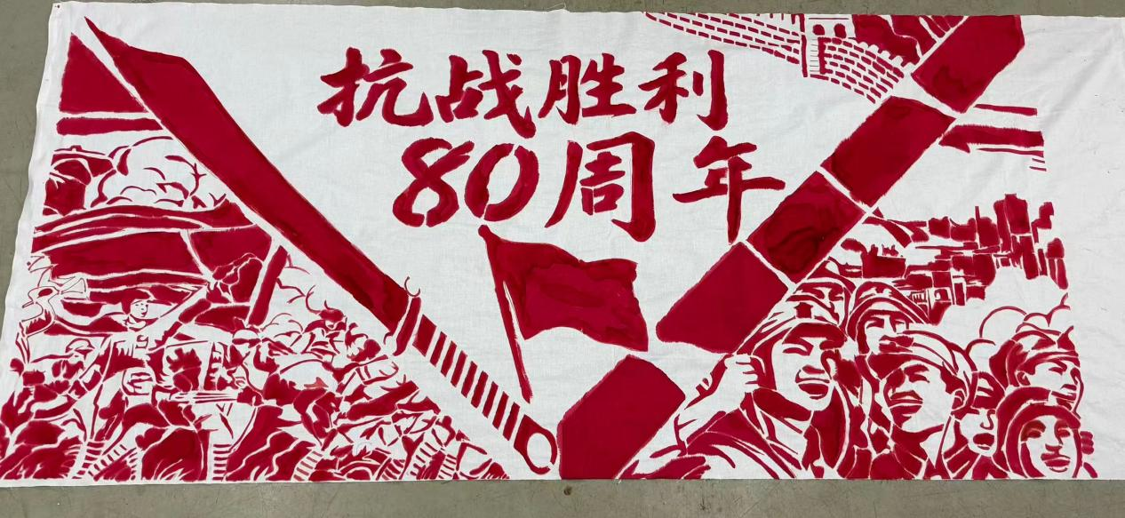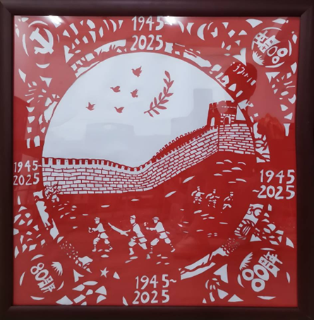 这幅刻纸作品,以纪念抗战胜利80周年为主题。主体以长城为依托,呈现抗战场景,战士们持枪御敌、运输物资,展现抗战的艰辛与抗争精神。白鸽、橄榄枝等元素传递和平愿景,党徽、“80周年”字样等元素,串联1945-2025年的时间线,借传统刻纸艺术,铭记历史、缅怀先烈,彰显了对和平的珍视与捍卫,是历史记忆与艺术表达的融合,唤起人们对那段峥嵘岁月的铭记与对和平的坚守。