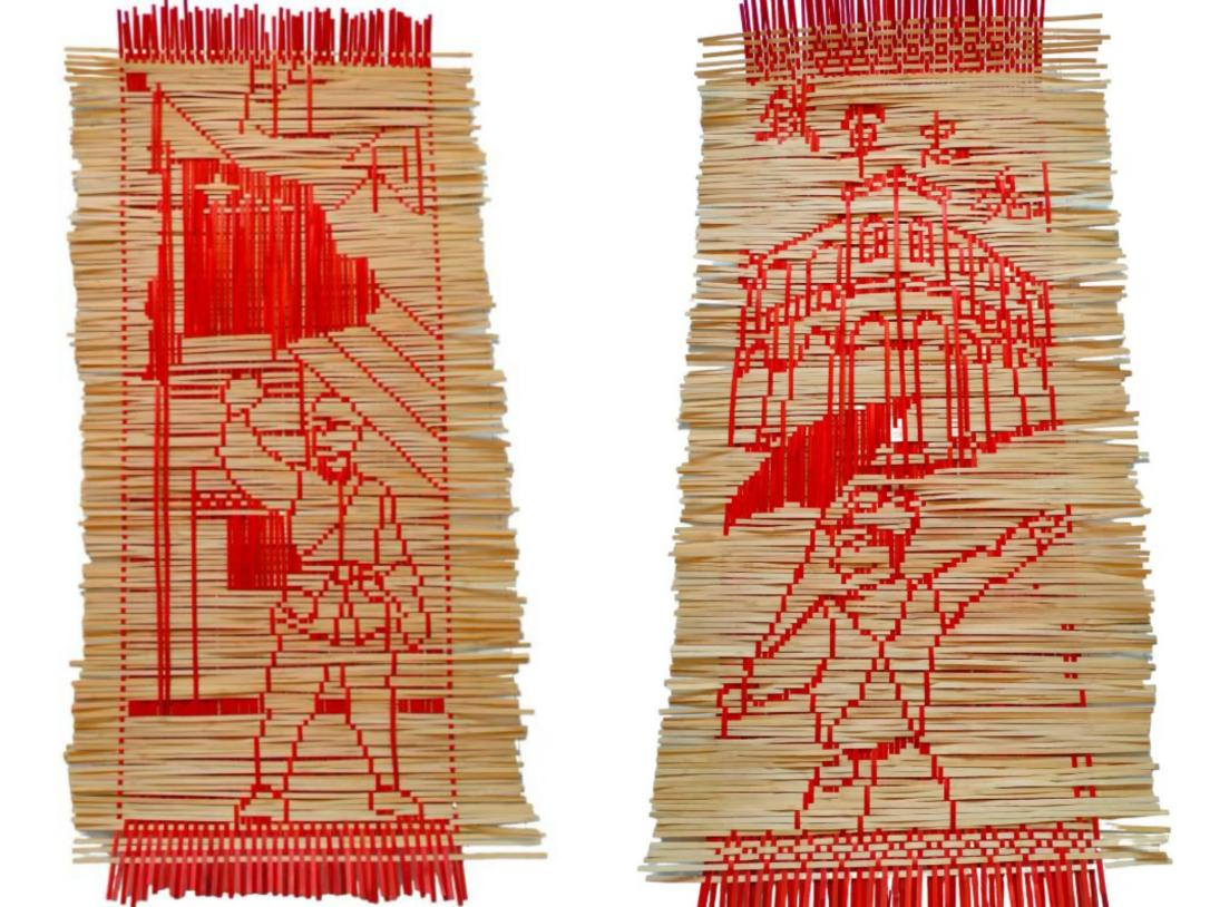 右边的这幅竹编画提取新四军旧址建筑“铁军忠魂”文字元素,借竹编独特纹理,呈现像素化效果。建筑于岁月的烽火中承载抗战历史,“铁军忠魂”字样传承新四军军人英勇无畏的精神,新四军军人形象,借竹丝勾勒身姿。以传统竹编为媒,编织铁军抗战功绩,让爱国精神随竹韵永存,唤醒当代人对峥嵘历史的铭记与传承。