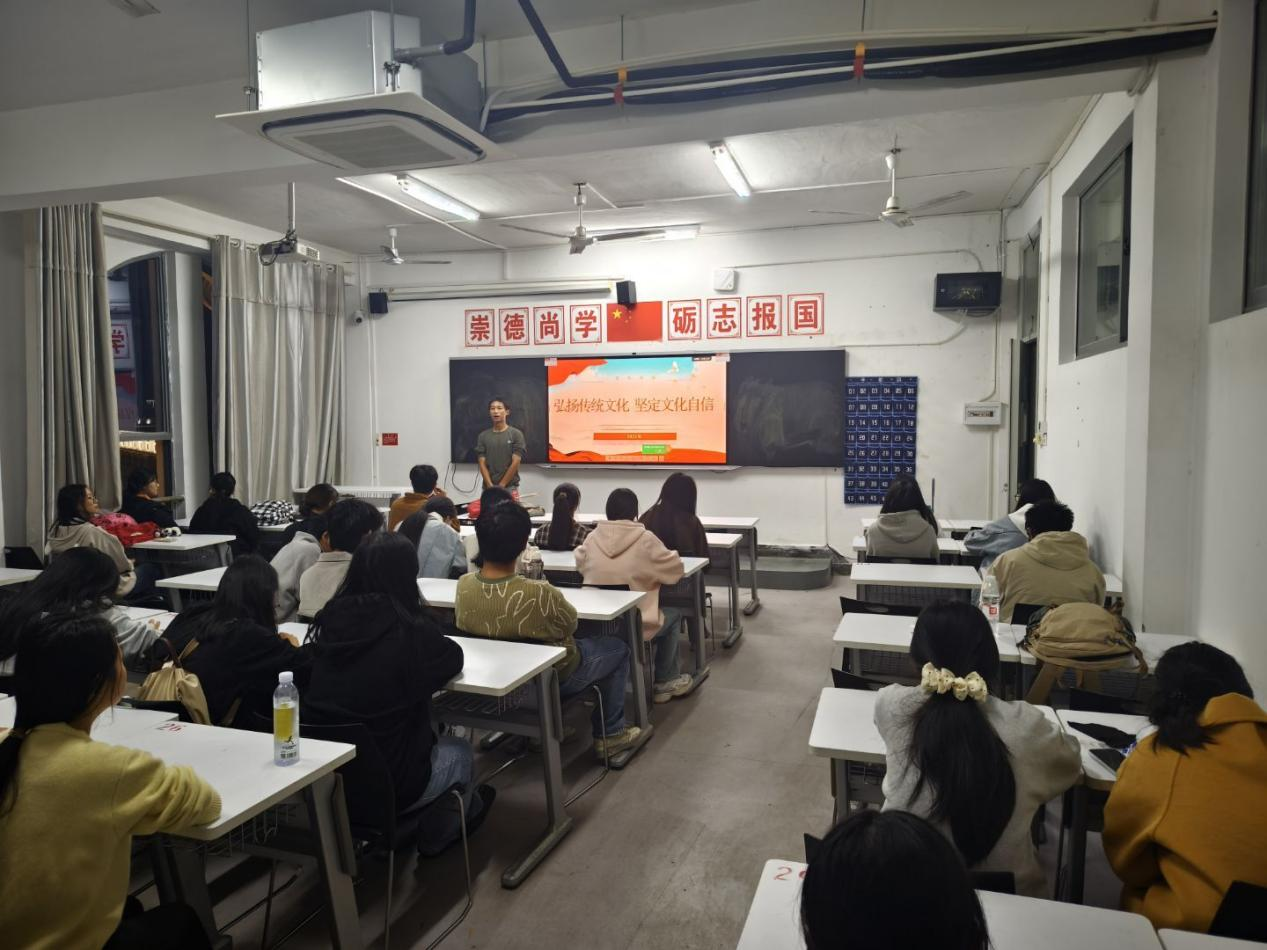 24级各班班会主题为“弘扬传统文化,坚定文化自信”。班会从夯实根基、守正创新、汲取力量三方面展开,班会先以“毒教材”事件警示文化入侵风险,再借北京冬奥会、李子柒等案例展现传统文化输出成果。接着通过《只此青绿》《国家宝藏》《哪吒2之魔童闹海》等,说明传统文化的创新转化。最后倡导大学生“过好”传统节日、“守好”传统文化、“推好”传统服饰文化。班会结尾,各班长布置了小组讨论任务,引导同学们思考文化安全挑战与自身践行文化自信的方式。