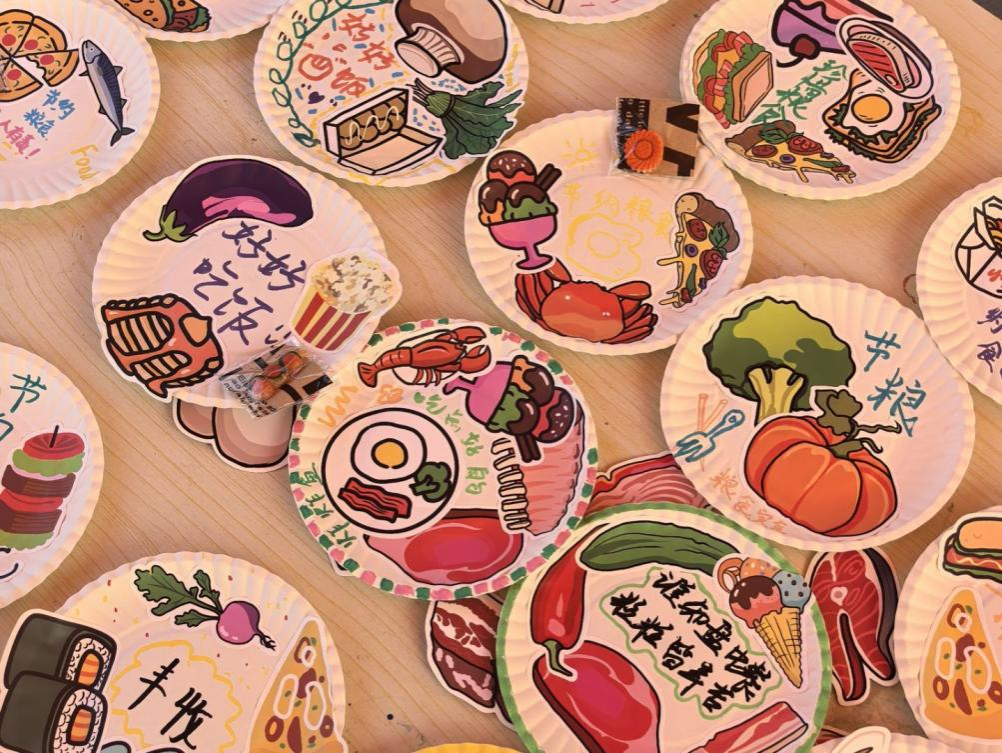活动现场,一顶橙色帐篷在绿意盎然的校园一角格外醒目。永利yl23411集团的志愿者们以纸盘为画布,用斑斓的色彩和巧思的设计,将对粮食安全的思考与对节粮风尚的倡导融于创作中。纸盘上,“谁知盘中餐,粒粒皆辛苦”的古训与卡通化的美食插画碰撞出别样火花;“好好吃饭”“节约粮食”的暖心标语,搭配着栩栩如生的蔬菜、肉类图案,让节约粮食的理念变得生动可感。每一个纸盘都是一份诚意满满的“节粮宣言”,志愿者们用艺术的笔触,将“珍惜每一粒米”的信念传递给校园里的每一个人。