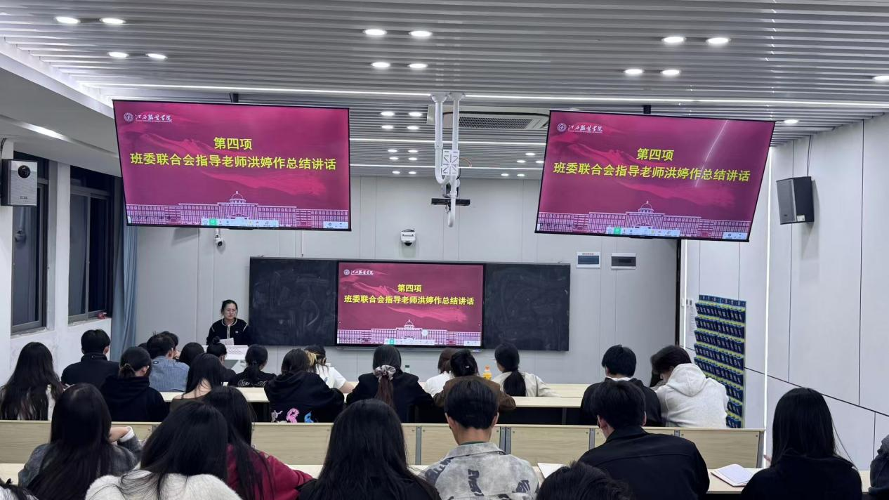会议第四项,由班委联合会指导老师洪婷作总结讲话。她首先肯定了各部门的工作推进情况,随后强调了本月班级管理的核心内容。一方面要进一步细化班级考核指标,同时需兼顾“班级秩序、活动参与、学风建设”等维度的公平性与导向性;另一方面针对班长、团支书“主心骨”角色,提出班级管理需抓牢“两个核心”:一是“抓人心”,主动关注同学们的需求、凝聚集体共识,以情感联结增强班级归属感;二是“抓机制”,建立清晰的班级事务分工、沟通反馈等机制,以制度规范提升管理效率。同时,她寄语全体班委共同打造学风正、班风优、凝聚力强的优秀班集体,为学院发展注入青春动能。