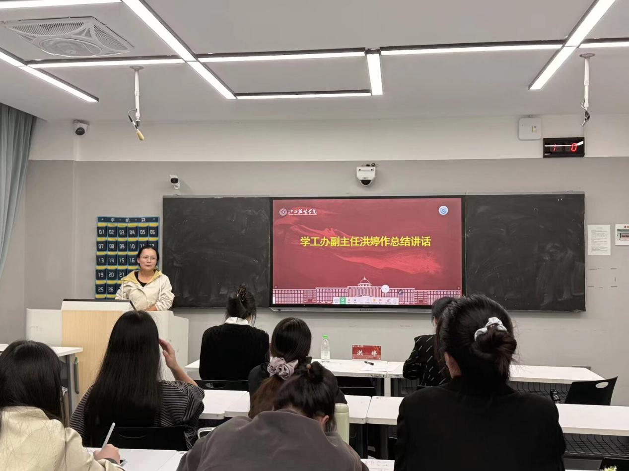 展示环节结束后,由洪婷作总结点评。她充分肯定了参赛选手的认真态度与综合表现,并就展示效果提出改进建议并强调“年度人物”评选不仅是荣誉的角逐,更是育人导向与榜样选树的重要载体,希望同学们以此为契机,持续提升综合素养,成长为具有引领力的新时代大学生。