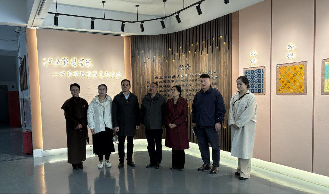 伍恒光一行首先参观了研究院的成果展厅、技艺工坊及面料再造实验室。研究院内系统收藏的精美丝绸织绣作品、丰富的传统纹样资料以及现场展示的精湛织造技艺,引起了来宾们的浓厚兴趣。研究院工作人员详细讲解了不同历史时期丝绸织绣的工艺特点、艺术风格及其文化内涵,展示了研究院在非遗保护、技艺传承及创新应用方面取得的系列成果。伍恒光书记对研究院深厚的学术积淀、鲜明的特色以及在传承中华优秀传统文化方面所做的扎实工作给予了高度评价。