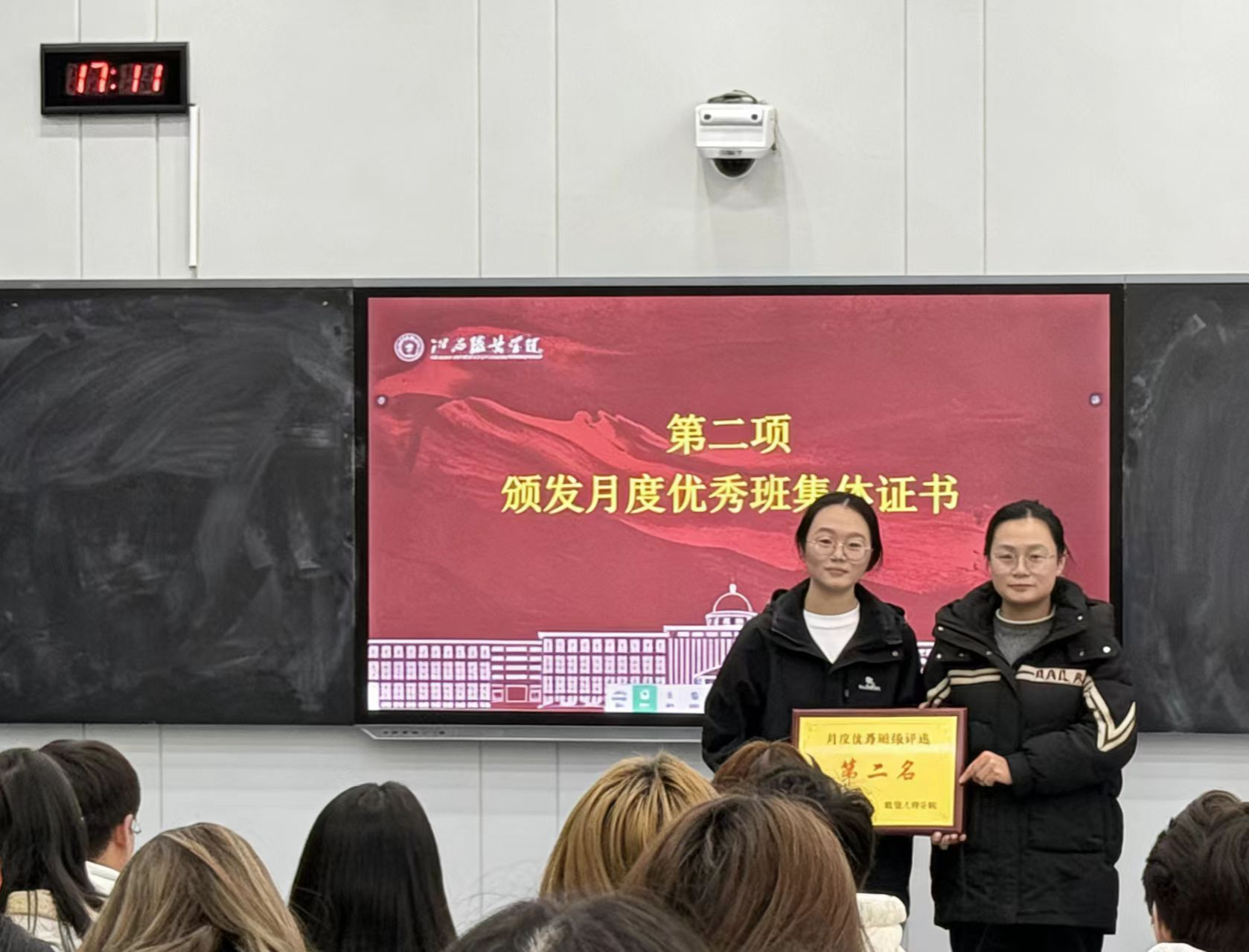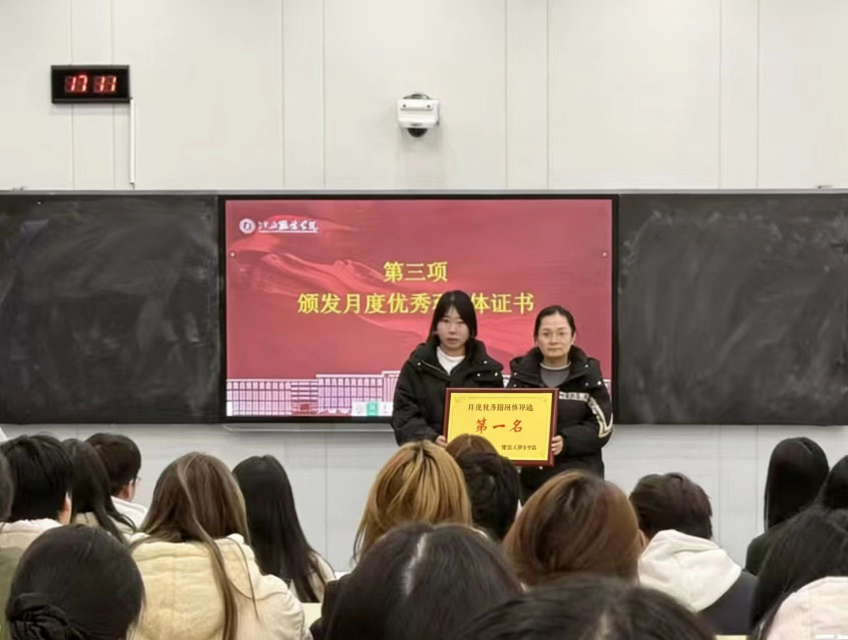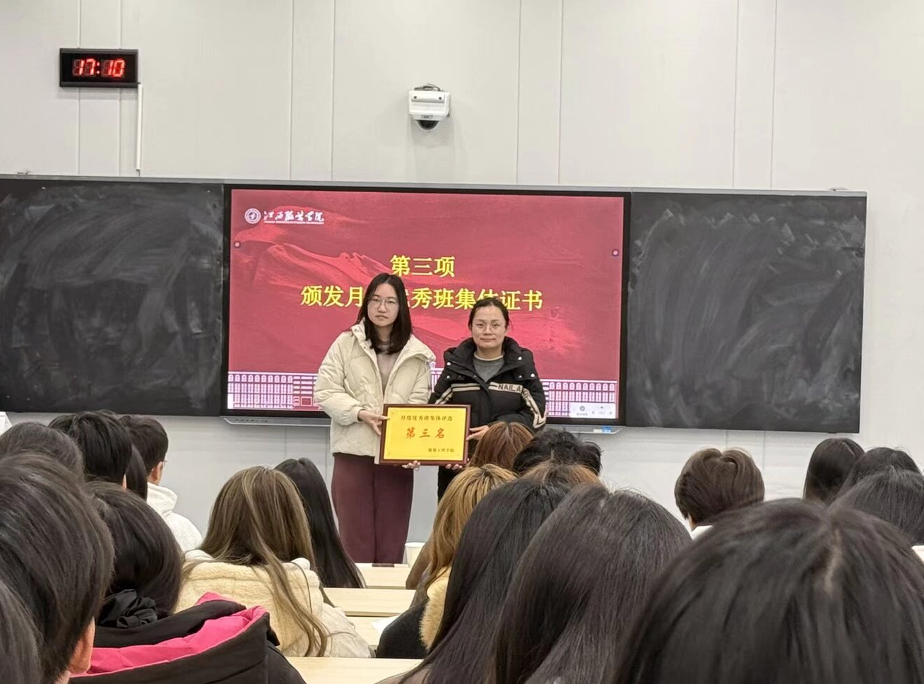 接下来,会议进行了月度优秀班集体表彰。根据2025年1月的综合评选,25纺织本科1班、25服教本科1班与25服工本科1班分获前三名。学工办副主任洪婷为获奖班级代表颁发了证书,并勉励他们再接再厉,发挥示范引领作用,带动全院班级共同进步。
