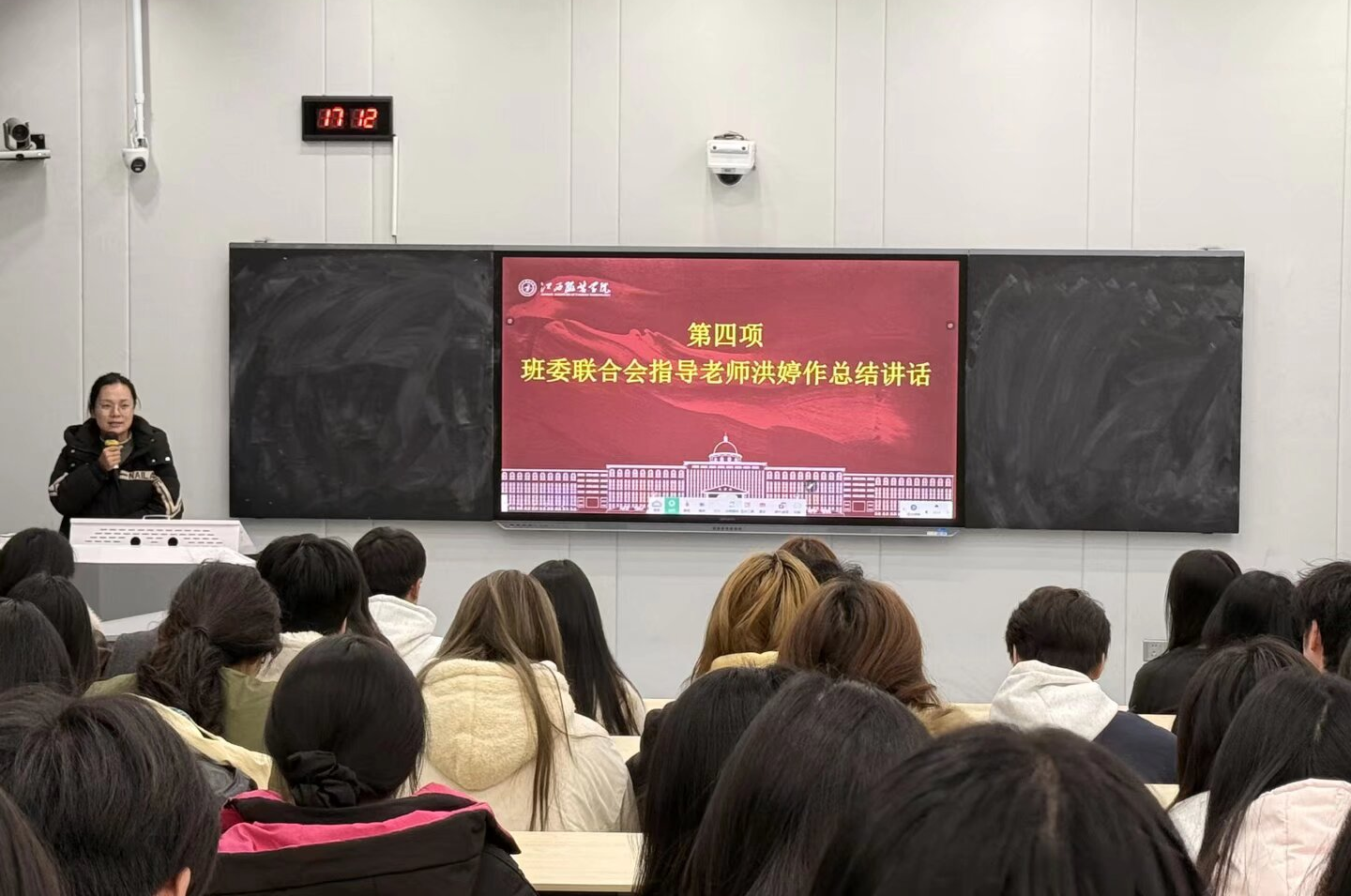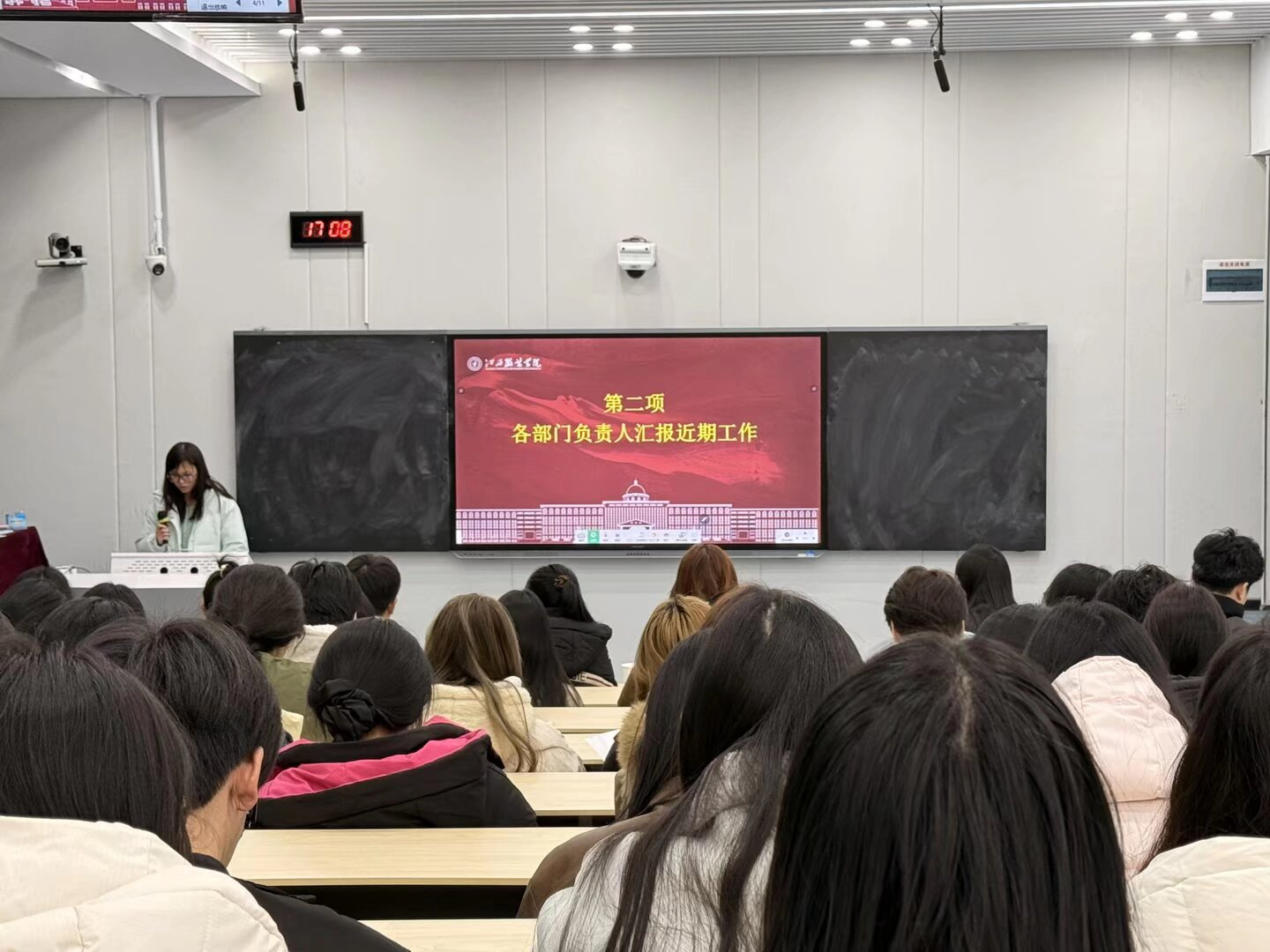 随后,职业能力发展中心与班级活动策划中心负责人分别汇报了近期工作情况。针对工作中发现的问题,两部门表示将加强联动督导,通过规范培训、定期检查与评比反馈等方式,督促各班提升工作质量与管理实效,进一步推动班级工作整体效能提升。