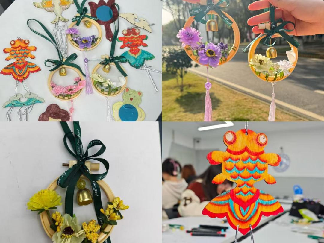 本次活动以创意手工制作为核心,精心设置了花环挂件制作、艺术镜子涂鸦、风铃DIY等趣味环节。活动现场温馨雅致,材料摆放整齐,同学们兴致盎然地挑选素材,指尖轻绕丝线、提笔勾勒色彩、精心搭配装饰,将巧思与心意融入每一件作品之中。在花环编织中感受自然之美,在镜子涂鸦中释放艺术灵感,在风铃制作中寄托美好期许,大家沉浸在手工创作的乐趣里,尽情展现着独特的审美与创造力。