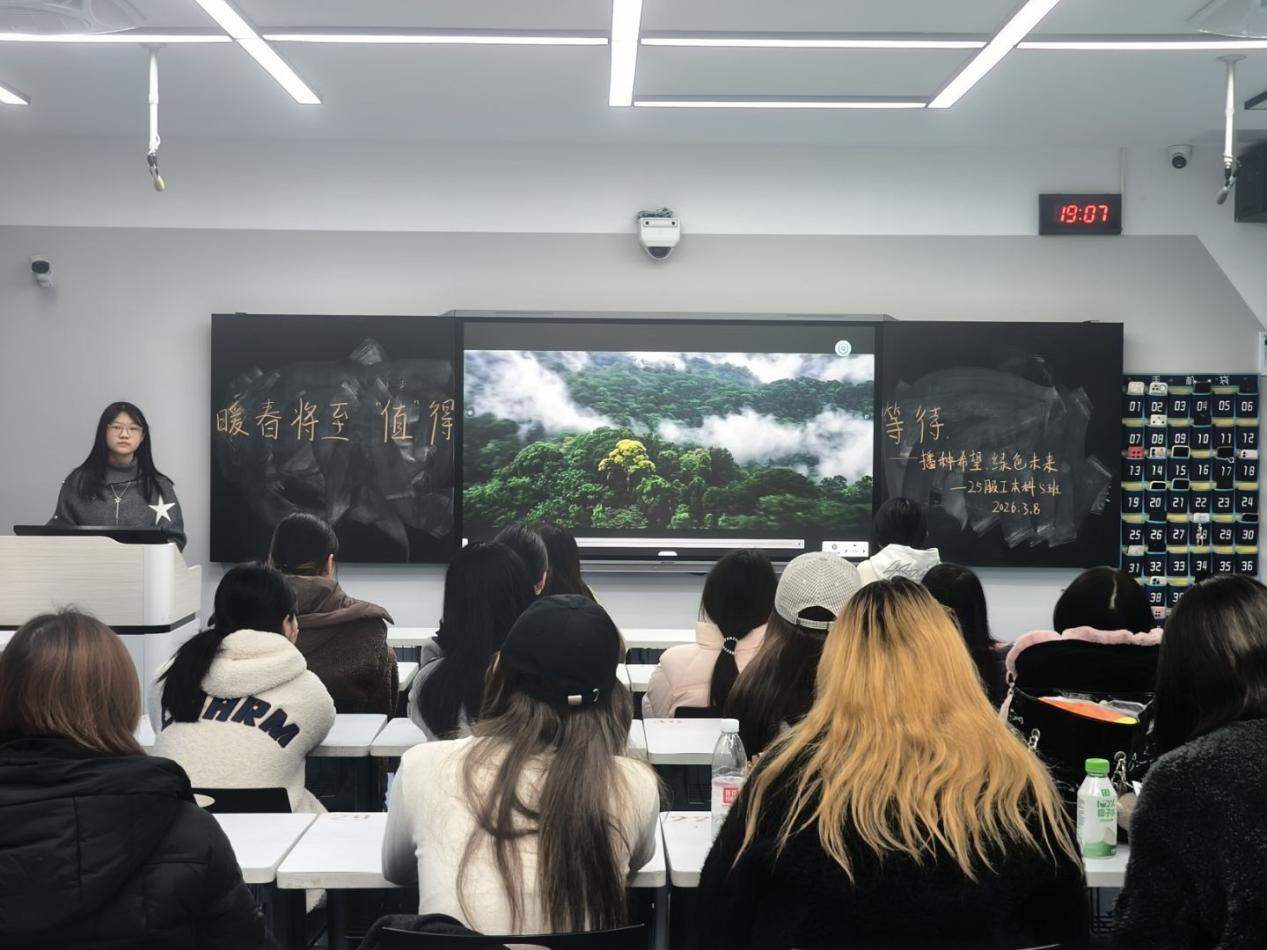 25级各班级以“暖春将至,‘植’得等待——播种希望,绿色未来”为主题,深入学习植树节的起源与发展、生态环保知识及生态文明建设理念。通过数据解读、视频观看和互动讨论,同学们深刻认识到植树护绿、保护环境的重要意义。有同学在分享环节动情地说:“每一抹绿色都来之不易,作为新时代大学生,我们要从节约用纸、低碳出行做起,用实际行动守护绿水青山。”班会结束后,很多同学主动报名参加即将开展的校园植树志愿活动。