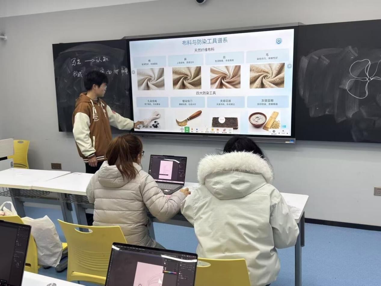 宣讲团从《诗经》“终朝采蓝”切入,梳理了蓝染数千年传承脉络:秦汉工艺成熟,唐宋达高峰并对外传播。通过图文详解其制作原理,从蓼蓝种植、发酵制靛到布料浸染氧化,揭示靛蓝素还原氧化反应中自然与技艺的完美融合,展现古人智慧与对自然之美的追求。宣讲过程中,同学们认真聆听,积极互动,对蓝染技艺表现出了浓厚的兴趣。不少同学表示,通过这次宣讲,不仅学到了专业知识,更深刻感受到了传统工艺所蕴含的文化底蕴与工匠精神。