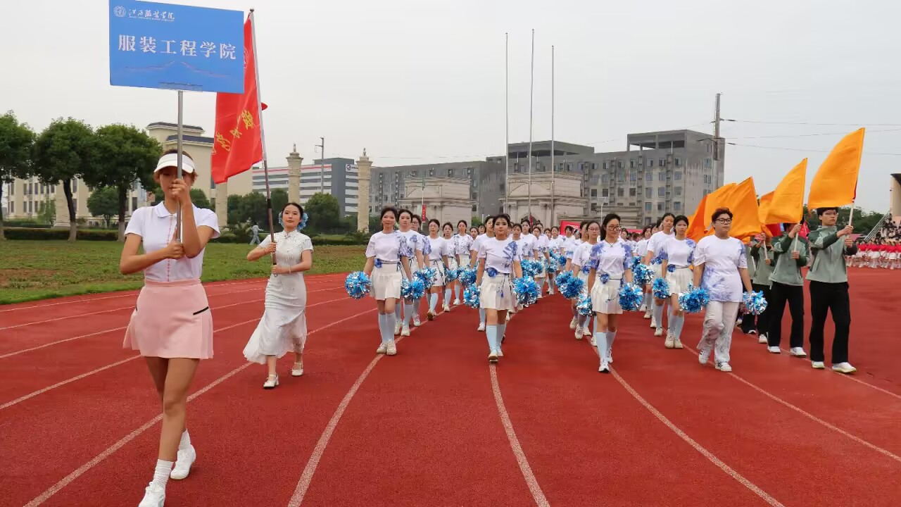 表演过程中,团体操队员们身着专属扎染队服,伴随着动感欢快的节奏,迈着灵动矫健的步伐、跳出整齐利落的舞姿,轻盈舒展的动作与随风摇曳的扎染裙摆相映成趣。传统手工工艺的独特质感、服装美学的色彩魅力与青春体育的蓬勃活力双向碰撞,既生动展现了学院学子朝气蓬勃、昂扬向上的精神状态,又淋漓尽致地凸显了服装工程专业特色,让专业素养在赛场舞台上尽情绽放,赢得了全场师生的阵阵掌声与喝彩。