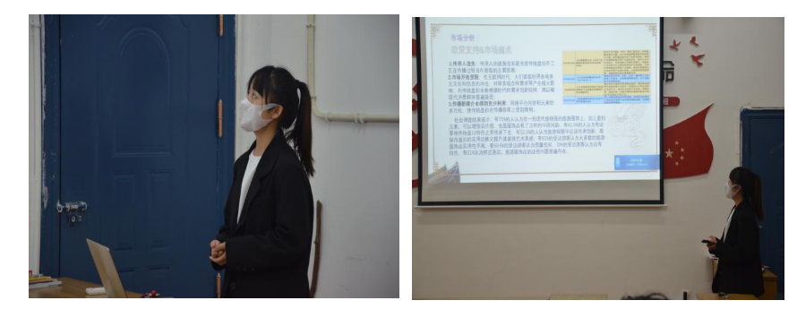 21服工Z1班聂美霞的主题是“创业在路上”。她详细介绍了项目经营状况、项目前景分析、项目优势及竞争力、管理理念、项目规模情况。并就项目的团队建设、核心技术、市场定位、商业模式等内容进行了重点阐述,并从如何找准团队优势、深入调研市场、调整项目等方面进行了详细的讲解。