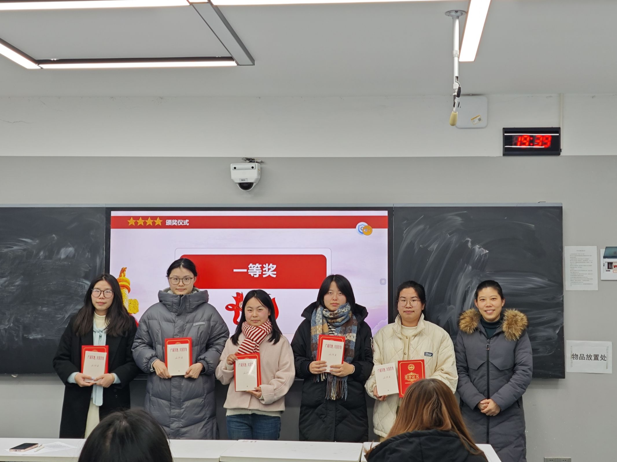 比赛正式拉开帷幕,各参赛队反应敏捷、配合默契。经过三轮紧张激烈的比拼,最终根据积分高低,三支队伍分获一、二、三等奖。在随后举行的颁奖环节中,学院党委委员蔡燕萍为获奖团队逐一颁发了荣誉证书及奖品,并向他们表示热烈祝贺。她勉励全体同学以此次竞赛为契机,真正做到“以赛促学、以学促行”,持续深化对党的创新理论的理解与把握,自觉将学习成果转化为坚定理想、指导实践的强大动力。