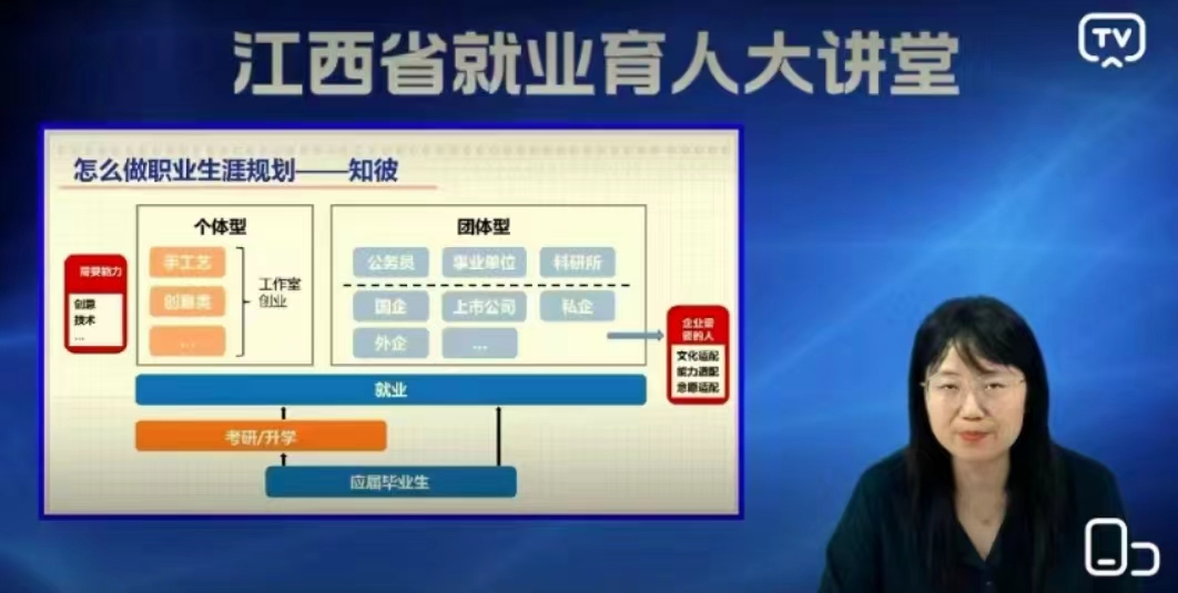 本次就业育人直播课特邀了有着12年校园招聘实践经验、曾多次担任高校大学生职业生涯规划大赛评委,现担任南昌海康威视高级人力资源经理的袁怀芳担任主讲老师。在直播课中,袁怀芳以“职业选择和求职技巧”主题展开授课。