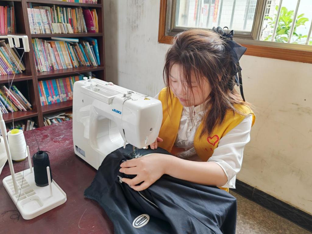 志愿者来到启明书院,向当地居民介绍了来意后,大家纷纷从家里拿来需要缝补的衣物。部分留守老人行动不方便,志愿者们就上门进行服务,将他们需要缝补的衣物带到启明书院。收到衣物后,志愿者们充分发挥了专业特长,穿针引线,有的手工缝补,有的用缝纫机作业,有的熨烫衣物,有的折叠整理衣物。最后,志愿者们缝补好的衣物返还给居民手中。
