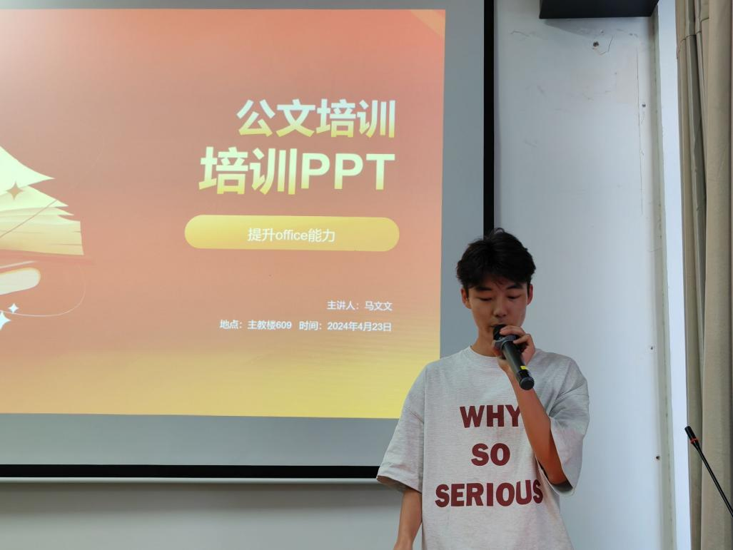 随后,由学生会马文文讲解工作计划、总结和策划书等的撰写方法。马文文通过生动的案例和详细的讲解,分享了自己在公文写作中的经验和心得,讲解了公文写作的技巧和要点。