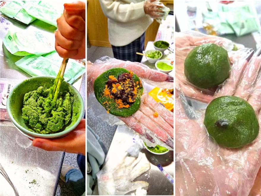 活动中,志愿者带领参与者清洗双手,戴上一次性手套,做好制作青团的准备。志愿者们详细介绍了青团的传统制作方法,带领大家忙碌起来,整个活动现场充满了欢声笑语。大家兴致勃勃,将准备好的面团、馅料切块、揉捏、包团,不一会儿,一个个通体青绿圆润可爱的青团就成型了。