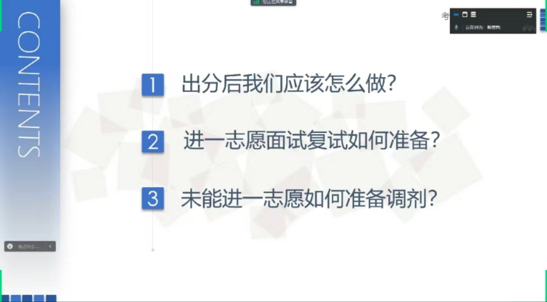 接着,赖嘉馨校友从“复试如何准备”、“如何调整查分心态”与“调剂时期相关事宜”三个方面进行答疑。复试时期需查找目标院校复试的往年真题复习资料,复试时问答从容。复试结束后,应及时调整心态,以轻松姿态等待查分结果。最后是寻找调剂院校,查询调剂名额,及时联系导师。