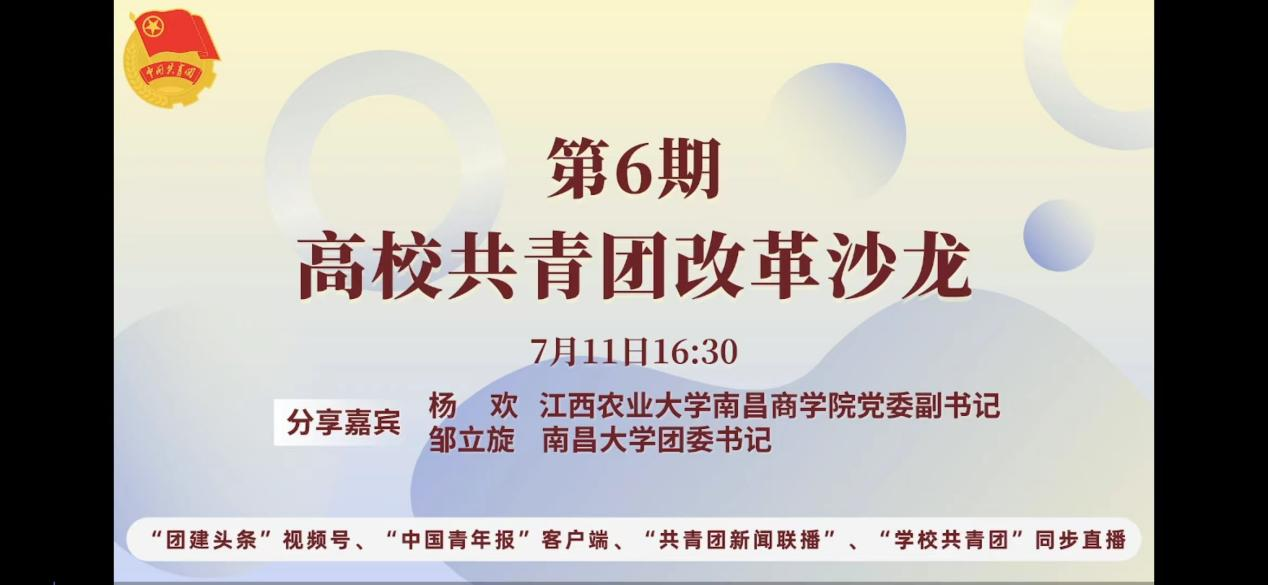 本次高校共青团改革沙龙直播特别邀请了江西农业大学南昌商学院党委副书记杨欢和南昌大学团委书记邹立旋向大家分享经验。杨欢老师以江西农业大学南昌商学院开展的团学工作为例,分享了高校共青团改革经验,分享的题目是《以“产品化”思维做好党的理论青年化阐释》,这是一条以团课为依托以产品化思维,通过青年大学习主题团课、话剧团课、舞蹈团课、就业团课等形式开展党的先进理论阐释道路,他强调这种理论产品化采用的是青年人易于接受的方式,将党的创新理论转化输出为有地方特色的红色文化产品,让青年人自己唱、自己讲、自己演、自己体验和感受,力争做习近平新时代中国特色社会主义思想的坚定信仰者和忠实实践者。