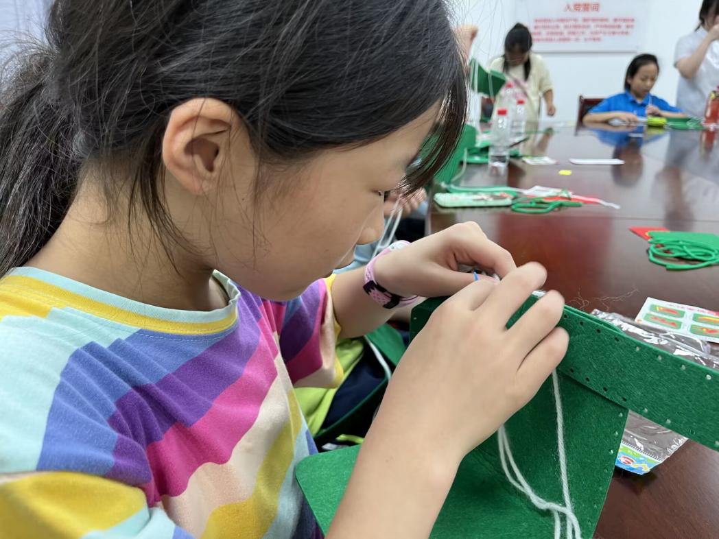 下午2:00,实践团队队员吕元莉结合服装专业知识教小朋友DIY制作红军包,活动中小朋友们表现出对手工制作的浓厚兴趣,认真按照讲解的步骤动手缝制红军包。在制作过程中,队员们向小朋友们讲述革命发展历史,讲述英雄革命先烈的伟大事迹,帮助小朋友们更好地理解红色文化,传承红色精神。