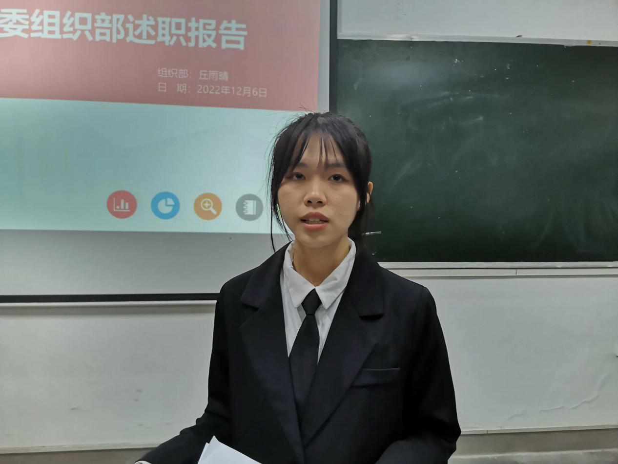 会议第二项,由分团委学生副书记宋书琦作述职报告。宋书琦详细地报告了本年度各部门开展的各项工作,总结了经验成果,指出了不足之处,针对活动中存在的问题指出了解决办法,并对下一年的工作进行了布置。