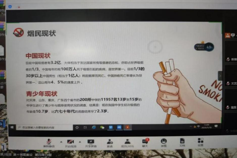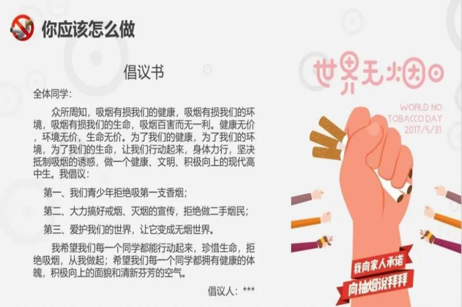 活动伊始,同学们观看了世界无烟日宣传视频。从中意识到吸烟群体呈现低龄化增长,新型电子烟抓住了青少年猎奇心理,吸引着青年。电子烟里的尼古丁、焦油等物质会损害青少年的身体健康,使得青少年患支气管等疾病相比于不吸烟的群体比例大大增加,吸烟有害青少年的身体健康。