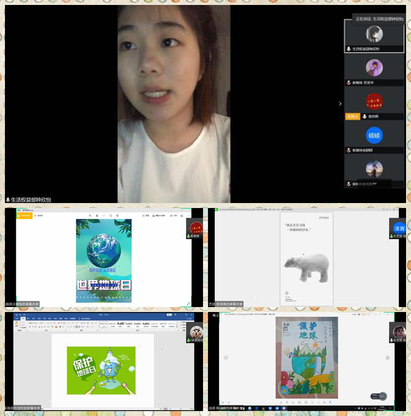 接下来的活动中,生活部的陈运媛同学,实践部的孙浩钧、汪静怡同学,文艺部的党泽青同学分别向我们展示了各自设计的主题海报。海报的内容丰富,形式构图多样,但都展现出同学们呼吁人与自然和谐共生的理念。钟欣怡同学为我们带来的《守护家园环境,讲好我们的地球故事》主题演讲中,她提到,环境的改善与我们息息相关,爱护地球需要每个人贡献力量。她呼吁各位服工学子,从身边的小事做起,共同守护校园环境,为我们的家园环境所付诸实践。