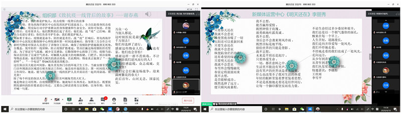 战“疫”捷报千里传,英雄故事万人颂。同学们满怀着热情,通过故事分享以及诗歌朗诵的形式,将一幕幕感人至深的画面展现在每个人的脑海。志愿者们坚守岗位,医护人员奋勇抗战,李兰娟院士鞠躬尽瘁……,在新年的漫天烟花中,多少人主动请缨,放弃与家人的团圆,毅然决然地在请战书上按下一个个鲜红的手印。我们看到他们不分日夜坚守在岗位,相互扶持,用坚实的臂膀筑起了不可摧毁的屏障,用实际行动创造了一个个感人至深的奇迹。
