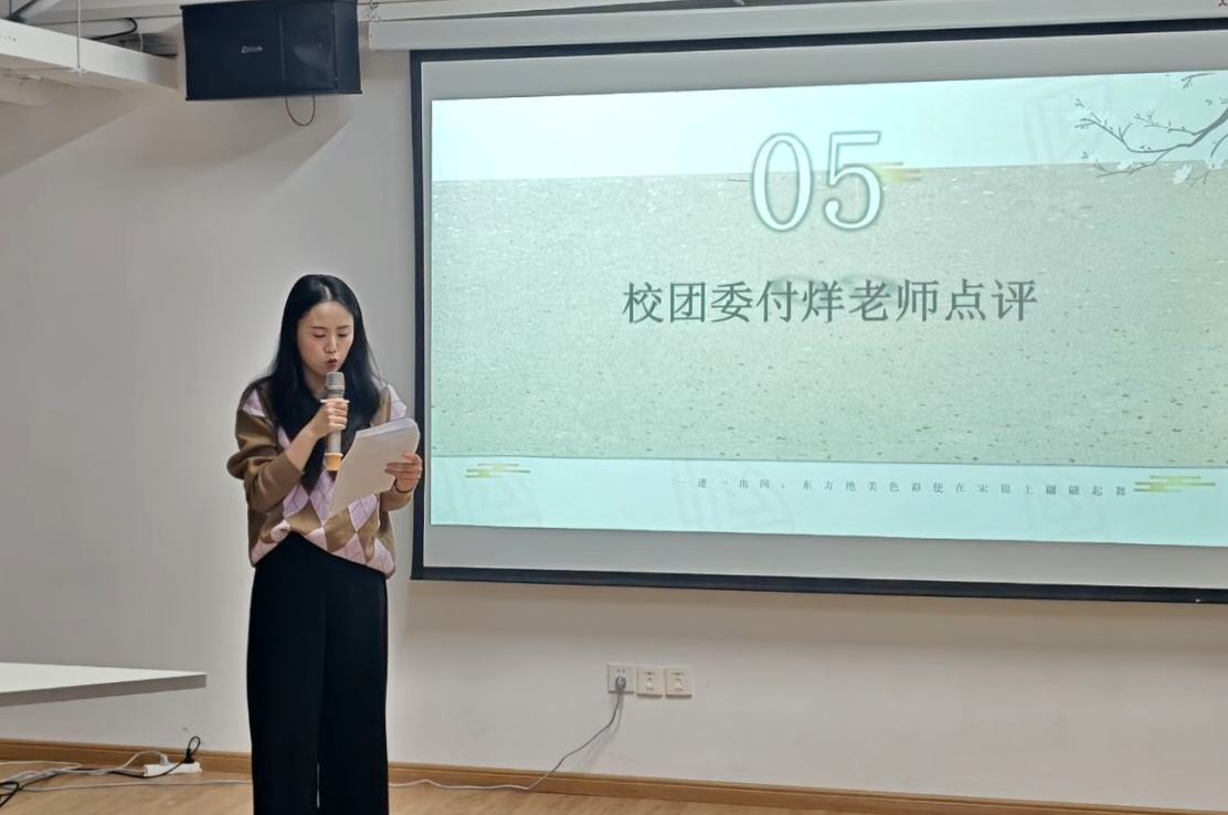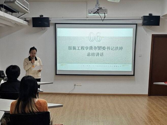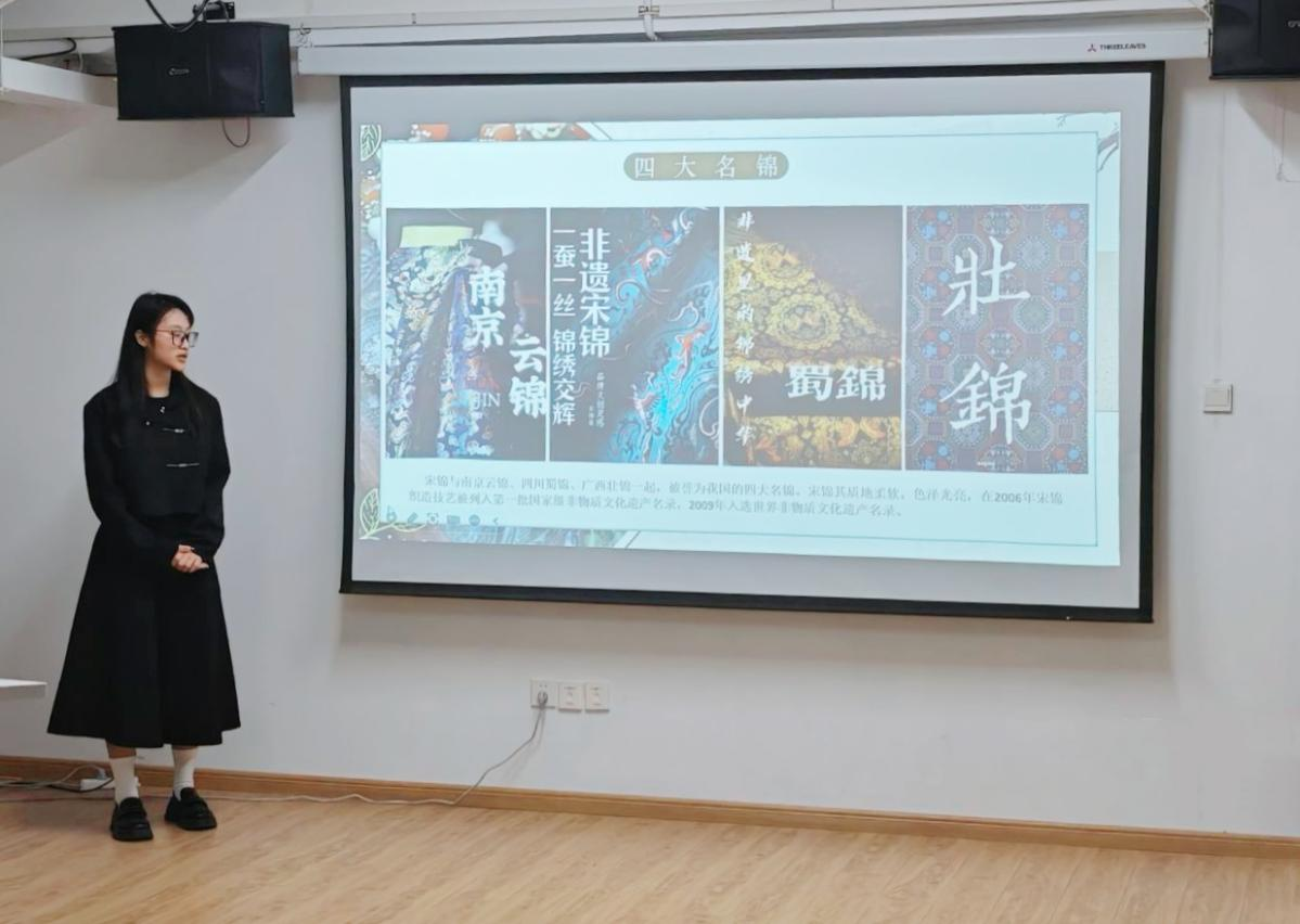 随后,学院分团委组织部负责人章傲霜带来了宋锦文化专题分享。章傲霜从宋锦的定义、品种分类、历史发展脉络等方面展开分享,详细介绍了宋锦“质地柔软、色泽光亮”的独特工艺特质,以及其作为“中国四大名锦”(与南京云锦、四川蜀锦、广西壮锦并称)、2006年入选第一批国家级非物质文化遗产名录、2009年跻身人类非物质文化遗产名录的深厚文化底蕴,使在场的团员们深刻认识到这项传统工艺的珍贵价值,激发了大家对非遗文化的探究热情。