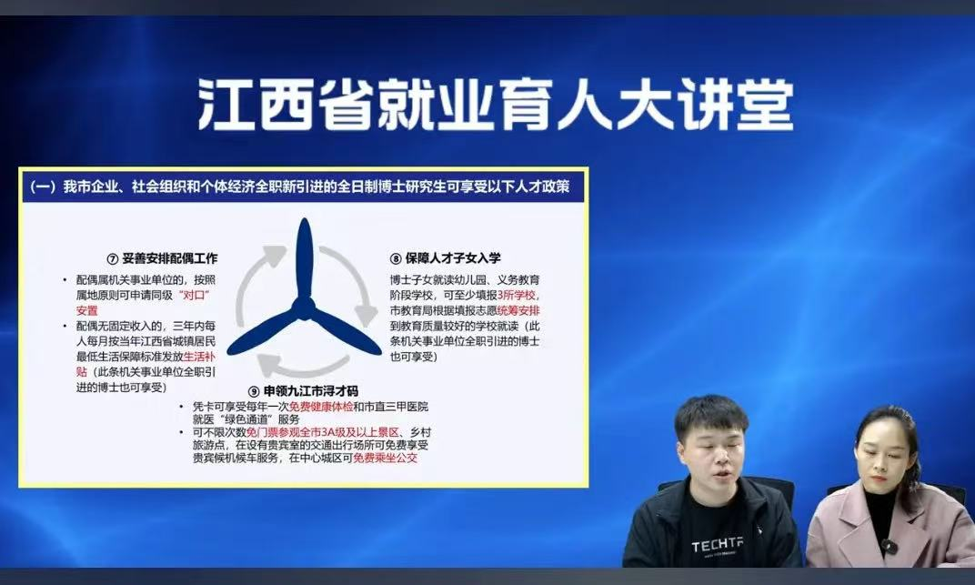 直播开场,九江市就业创业服务中心率先登场。他们对人才引进政策进行了细致入微的讲解,为求职者清晰地勾勒出政策福利与发展机遇的蓝图。这不仅增强了求职者在九江就业的信心,更为他们在这座城市开启职业生涯提供了有力的政策保障。例如:对于全日制博士研究生,在子女入学方面,博士子女就读幼儿园、义务教育阶段学校时,可至少填报3所学校,市教育局会依据填报志愿统筹安排至教育质量较好的学校就读,这项政策让博士们无需为子女的教育资源担忧;在配偶安置上,配偶属机关事业单位的,按照属地原则可申请同级“对口”安置,配偶无固定收入的,三年内每人每月按当年江西省城镇居民最低生活保障标准发放生活补贴,解决了博士们的后顾之忧;此外,博士们还可申领九江市浔才码,凭借此码,博士们能享受每年一次免费健康体检、市直三甲医院就医“绿色通道”服务,不限次数免门票参观全市3A级及以上景区和乡村旅游点,在设有贵宾室的交通出行场所免费享受贵宾候机候车服务,在中心城区还能免费乘坐公交,一系列福利政策全方位提升了人才在九江的生活品质。