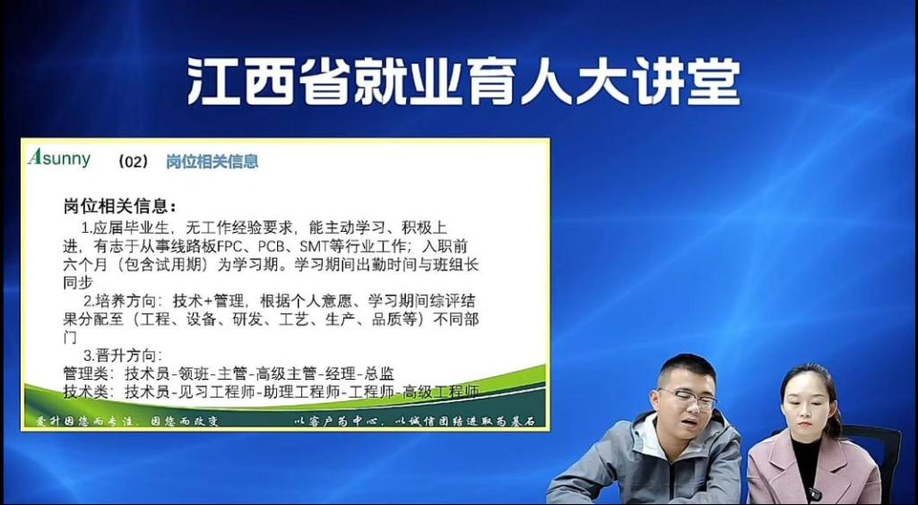 紧接着,九江天赐高新材料有限公司、江西爱升精密电路科技有限公司、江西汉可泛半导体技术有限公司等企业纷纷亮相直播间,开启直播带岗环节。各企业代表热情满满,全方位地介绍了企业的发展历程、各自的企业文化、具体的岗位需求、极具吸引力的薪资待遇以及清晰明确的职业发展路径。以江西爱升精密电路科技有限公司为例,其招聘的岗位面向应届毕业生,无需工作经验,只要你能主动学习、积极上进,有志于从事线路板FPC、PCB、SMT等行业工作即可。入职前六个月(包含试用期)为学习期,学习期间出勤时间与班组长同步。培养方向为技术+管理,企业会根据个人意愿、学习期间综合评价结果分配至工程、设备、研发、工艺、生产、品质等不同部门。员工晋升方向清晰明确,管理类从技术员起步,逐步晋升为领班、主管、高级主管、经理直至总监;技术类则从技术员成长为见习工程师、助理工程师、工程师、高级工程师,为求职者提供了广阔的职业发展空间。