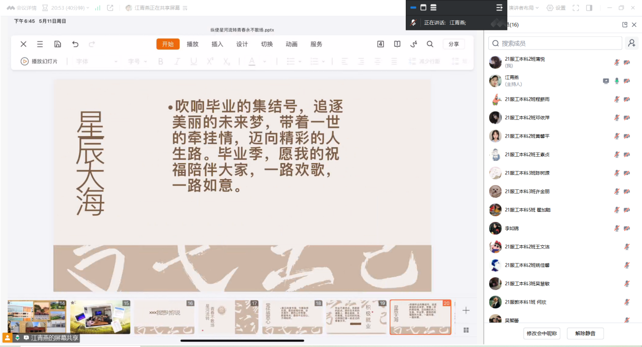 永利yl23411集团讯(撰稿:黄勇崧)5月11日晚7:00,永利yl23411集团大四各班级开展了主题为“毕业班:纵使星河流转,青春永不散场”的主题班会旨在激励毕业生珍惜在校时光,勇敢面对未来挑战,让青春永不散场。