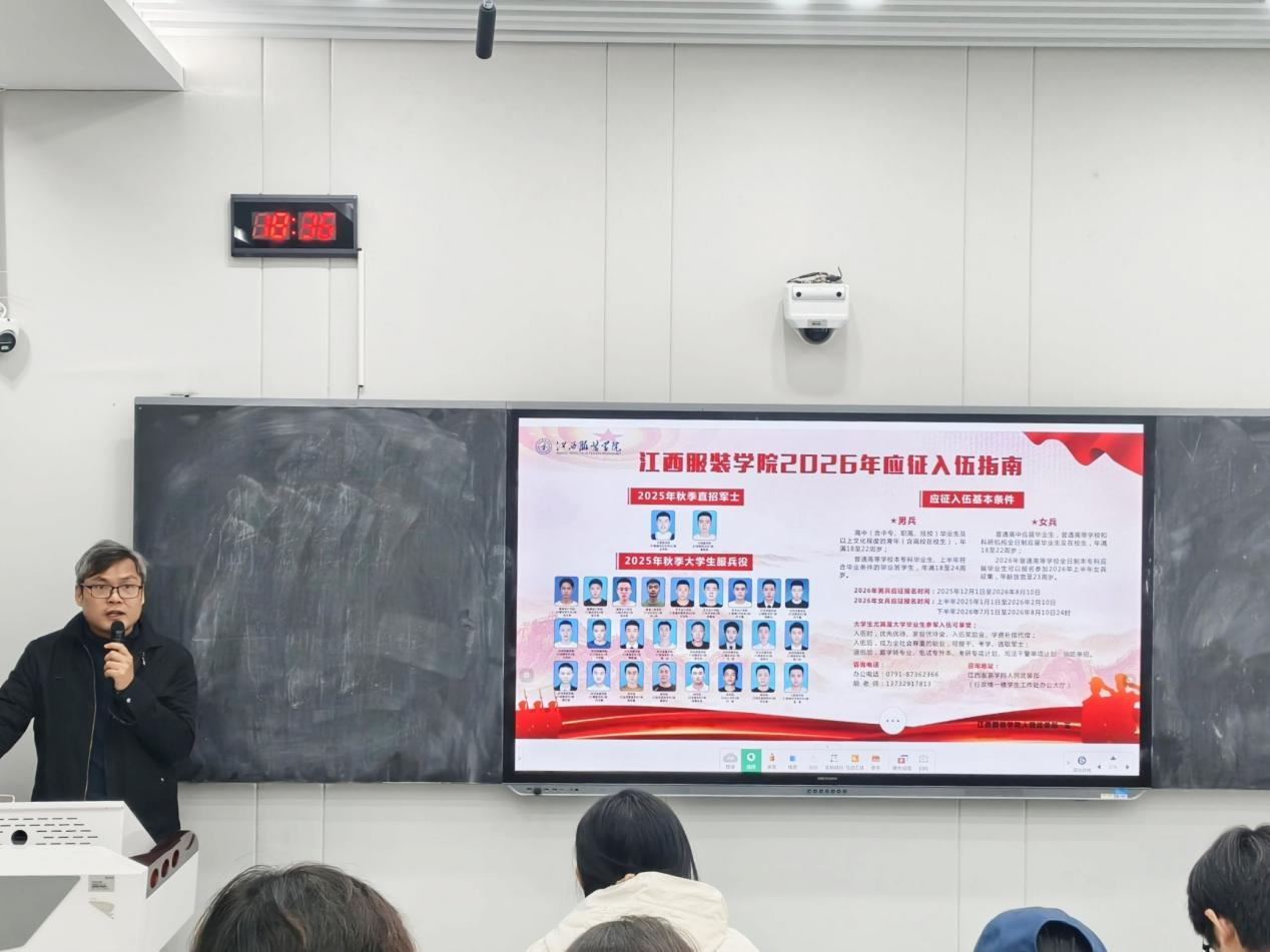宣讲会上,胡康通过专题宣讲、PPT展示、现场答疑等形式,向同学们详细解读了国家入伍征兵的相关政策、报名流程、优抚待遇及职业发展优势,重点讲解了大学生参军的学历保留、学费补偿等专属政策。