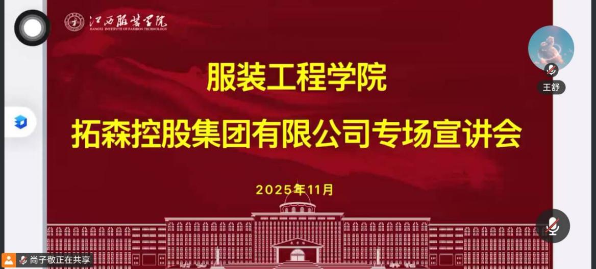 为深化校企合作协同育人机制,拓宽毕业生就业渠道,助力2026届学子精准对接优质就业资源,11月26日,服装工程学院联合拓森控股集团有限公司举办了线上专场招聘会。本次招聘会以“云端聚力·职引未来”为主题,吸引了学院应届毕业生踊跃参与,搭建起企业与学子高效对接的线上沟通桥梁。