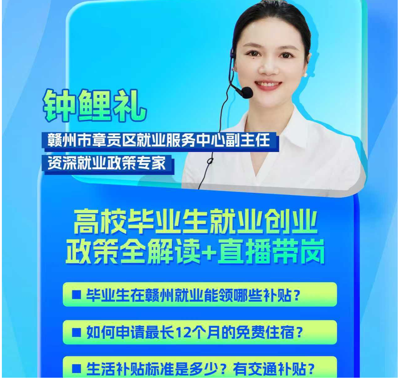 本次直播课邀请了赣州市章贡区就业服务中心副主任、资深就业政策专家钟鲤礼老师,围绕高校毕业生就业创业政策进行了全面解读,并且联动赣州优质企业开展了直播带岗。