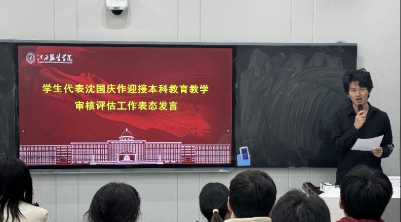 会议第三项,由学生代表22服工本科1班沈国庆作表态发言。沈国庆表示,作为班干部,他将在思想上充分重视此次审核评估工作,增强责任意识,在做好自己的同时带动周围的同学,在学习和生活的细节中督促同学们规范行为,确保审核评估要求融入日常、融入到每个人,以饱满的精神状态、良好的学习风气及文明礼仪习惯,迎接学校本科教育教学审核评估工作。