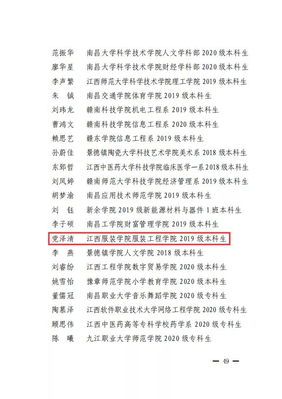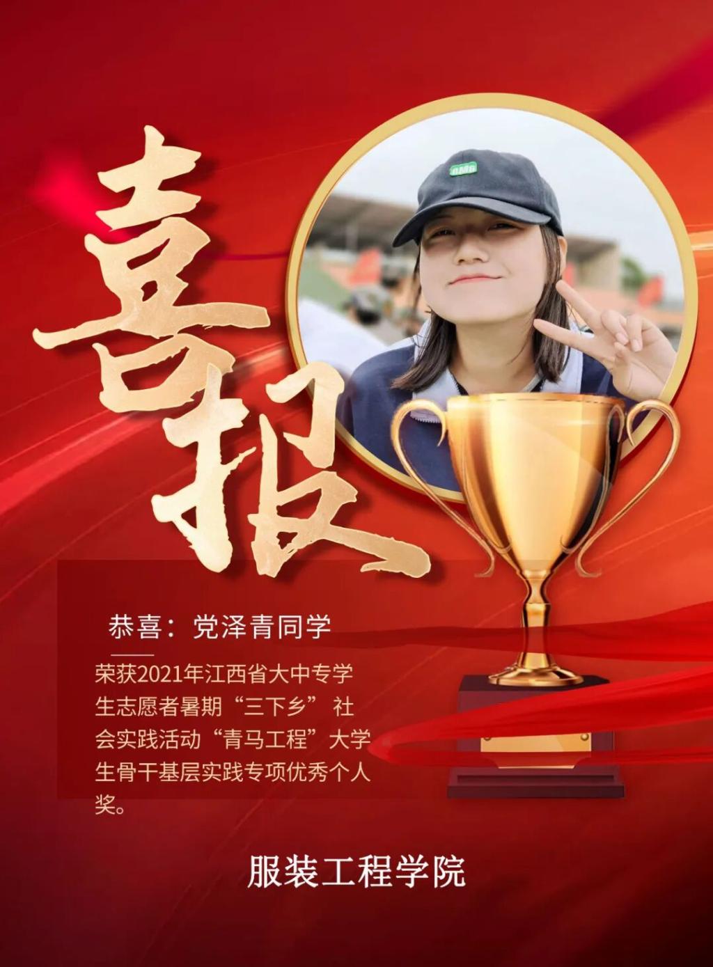 祝贺我院19级服装现代工程本科4班的党泽青同学在2021年江西省大中专学生志愿者暑期“三下乡”社会实践活动中荣获“青马工程大学生骨干基层实践专项优秀个人奖"。希望党泽青同学在今后的学习中再接再厉、开拓进取,努力取得新的更大的成绩。