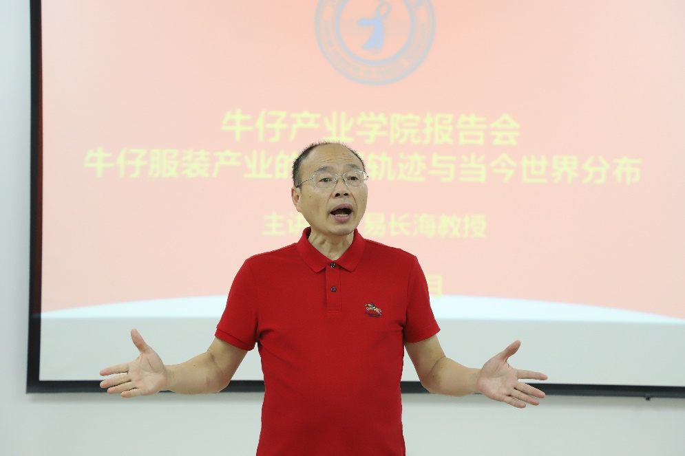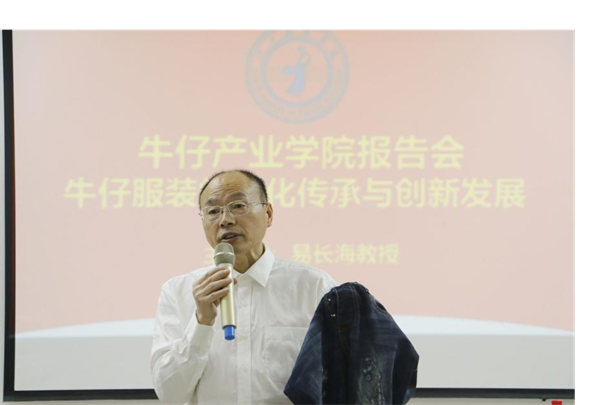 图1易长海教授做“牛仔服装的文化传承与创新发展”主题报告