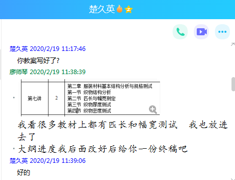 在接到学校通知后,廖师琴老师作为服装工程学院纺织材料工程教研室主任,迅速行动起来,发挥示范引领作用,认真研究服装超星、服装学堂、学堂在线、在线优慕课和智慧树等平台,最终选择在“服装超星一平三端”平台建设课程。积极组织课程组教师进行线上集体备课,制定教学大纲、进度和考核方案,精心备课、制作ppt,克服软、硬件困难录制和剪辑视频,建设题库、作业库等,为线上教学的开展做好了充足的资源准备。