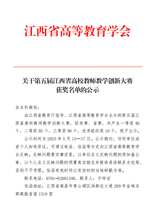根据《关于第五届江西省高校教师教学创新大赛获奖名单的公示》文件中。我院章华霞教授在新工科正高组荣获一等奖。