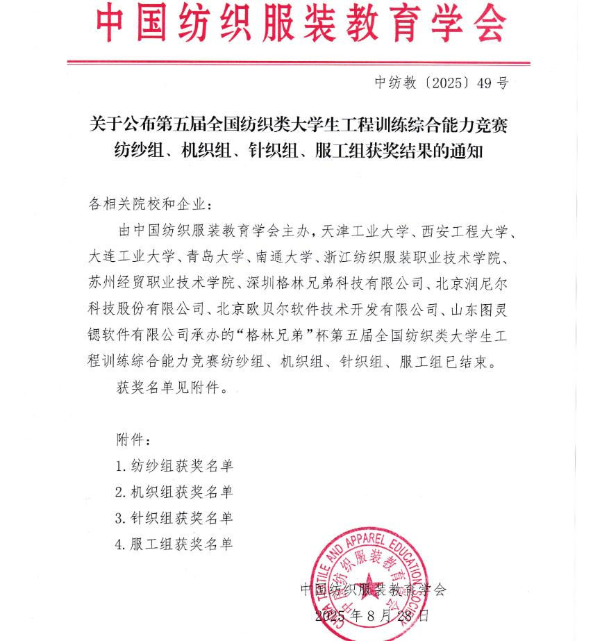 由中国纺织服装教育学会主办,天津工业大学、西安工程大学、大连工业大学、青岛大学、南通大学、浙江纺织服装职业技术学院、苏州经贸职业技术学院、深圳格林兄弟科技有限公司、北京润尼尔科技股份有限公司、北京欧贝尔软件技术开发有限公司、山东图灵锶软件有限公司共同承办的“格林兄弟”杯第五届纺织类大学生工程训练综合能力大赛,已顺利落下帷幕。本届大赛以纺织工程领域创新实践为核心,吸引全国高校学子踊跃参与,充分彰显了纺织类工程教育的卓越成果与青年学子的专业风采。