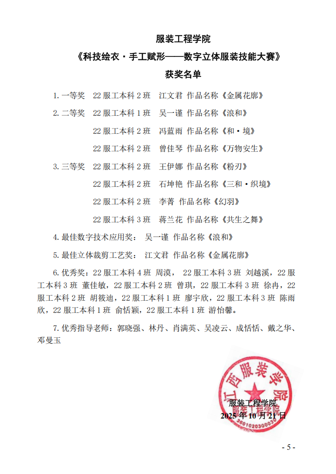 附:永利yl23411集团“科技绘衣·手工赋形”数字立体服装技能大赛获奖名单