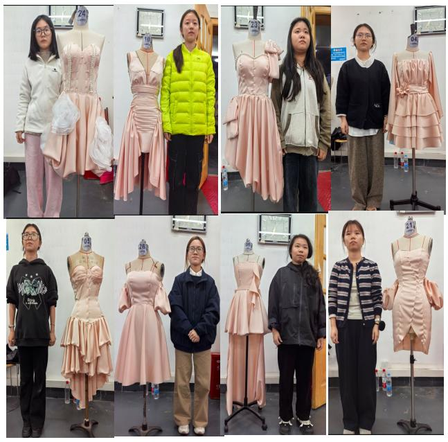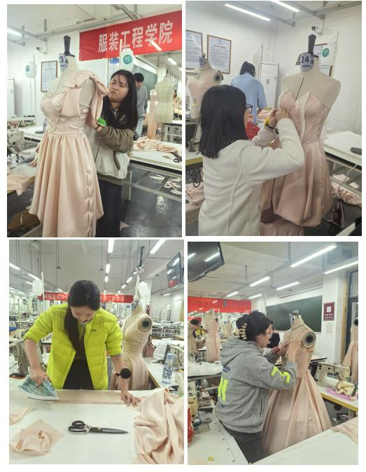 决赛当天 13:30,选手们从初赛提交的 3 套“和”主题小礼服 3D 建模作品中任选 1 套,在 5 小时内完成从“虚拟”到“实体”的转化。他们手持剪刀、皮尺等工具,专注地处理面料、精准裁剪、细致缝合,将数字模型中的流畅线条与立体结构逐步转化为真实可触的服装作品。现场不仅展现了选手们扎实的手工技艺,更体现了“虚拟设计→实体落地”的全流程实践能力。