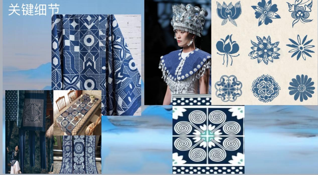 作品《青染序》以贵州蜡染这一珍贵非遗技艺为核心灵感源泉,深度挖掘丹寨蜡染的文化内涵与艺术精髓。设计中,张雪涵精准萃取丹寨蜡染标志性的靛蓝主色调,搭配简约留白,巧妙还原了蜡染“青出于蓝而胜于蓝”的独特染色意境,视觉上既沉稳大气又不失灵动雅致。纹样设计方面,她精心挑选冰纹、花卉、螺旋纹等蜡染经典纹样,通过提花、拼接等现代工艺进行立体呈现,既保留了手工蜡染特有的肌理质感与温度,又赋予传统纹样全新的视觉表达。
