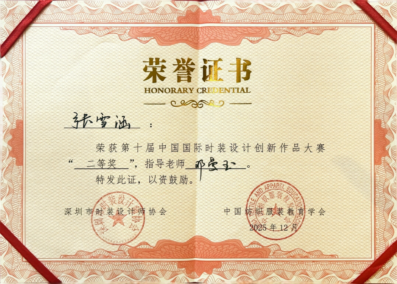 本次大赛由深圳市时装设计师协会、中国纺织服装教育学会联合主办,深圳市欧纺服装研究院、深圳时尚周文化传播有限公司、广东时尚文化创意产业服务中心共同承办,是国内时装设计领域极具影响力与专业性的权威赛事。赛事自启动以来,吸引了全国百余所高校、知名服装企业及专业设计机构的踊跃参与,共征集到参赛作品300余份。经过行业专家、知名设计师组成的评审团严格初审、复审及终审等多轮遴选,最终仅有30组作品晋级总决赛。大赛设置一等奖1名、二等奖5名、三等奖12名,竞争异常激烈。张雪涵凭借扎实的专业功底、独特的设计理念与精湛的呈现效果,在众多优秀作品中崭露头角,成功斩获二等奖,充分展现了当代青年设计师的创新实力与文化担当。