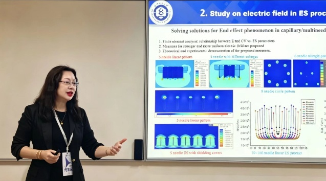 yL23411永利集团江西省现代服装工程研究中心主任刘延波教授作为本次会议学术委员代表江服参会,担任第一分会场主席并作了题为“规模化静电纺丝新技术、新材料研究进展“的邀请报告,收到了与会者的关注和好评,多位企业和高校代表表达了愿意与刘教授后续合作开发规模化静电纺丝设备,以及合作开展纳米纤维基防水透湿膜、柔性智能传感等纳米纤维材料的意愿。